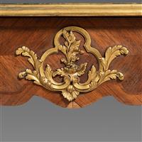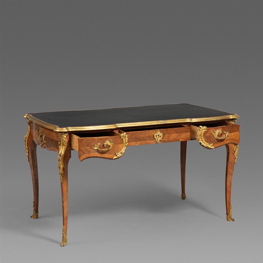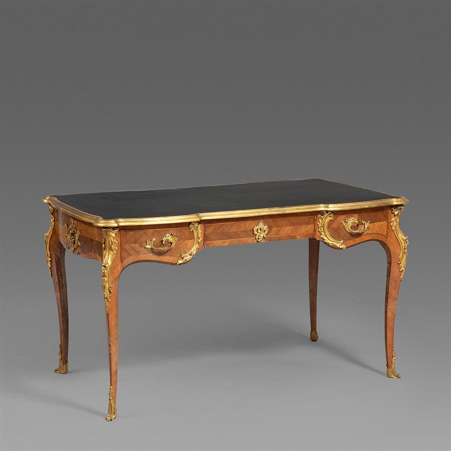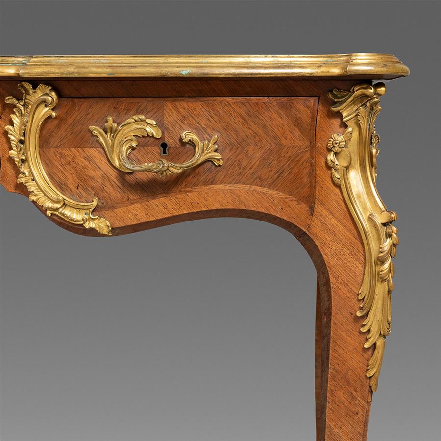 路易十五洛可可风格,橡木主体,西阿拉黄檀木镶花贴面。黑色牛皮桌面外缘装饰铜鎏金边条,三只楣抽屉装饰呼应的铜鎏金茛苕枝叶拉手和锁眼盖,两侧板装饰有铜鎏金枝叶花卉饰件;三弯腿立柱装饰上下呼应的铜鎏金茛苕叶饰。中央抽屉锁具面板有制造商P. SORMANI / 10 rue Charlot / PARIS刻印签名。