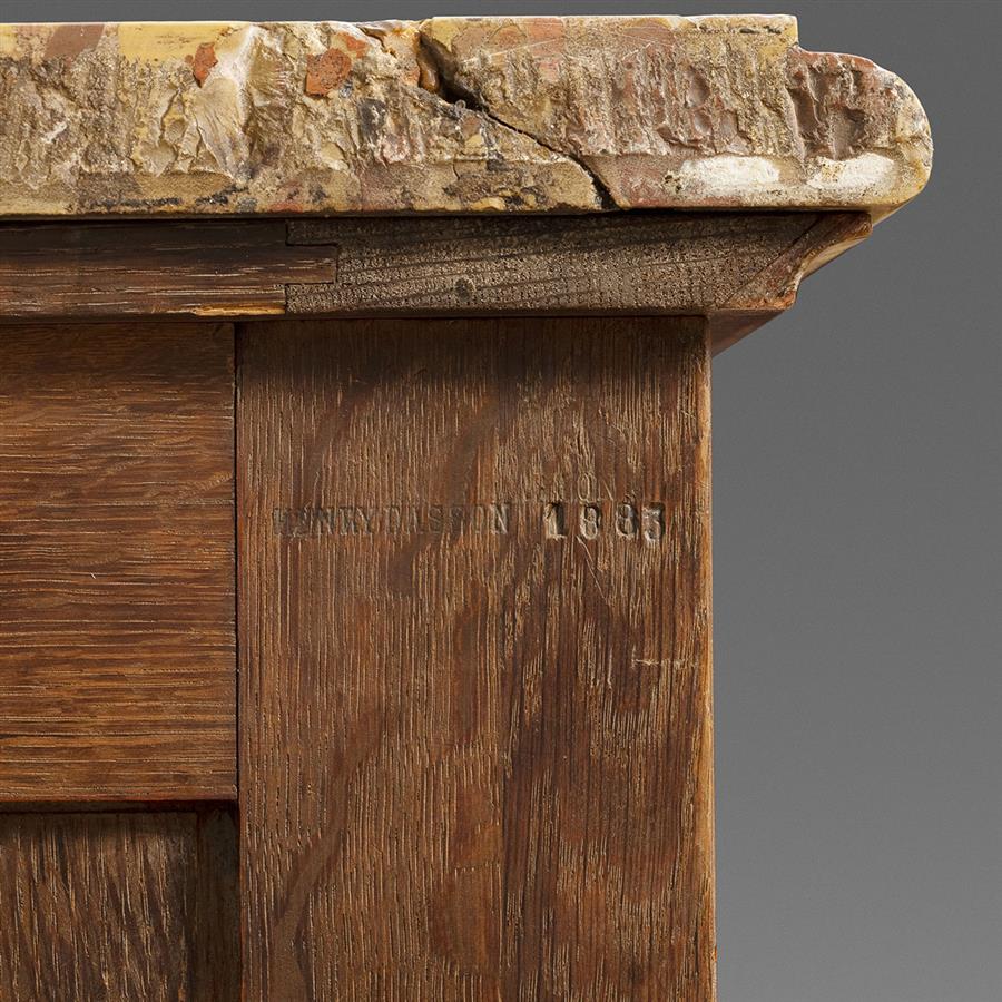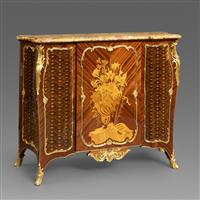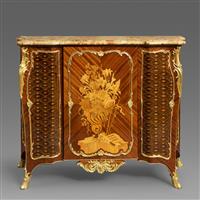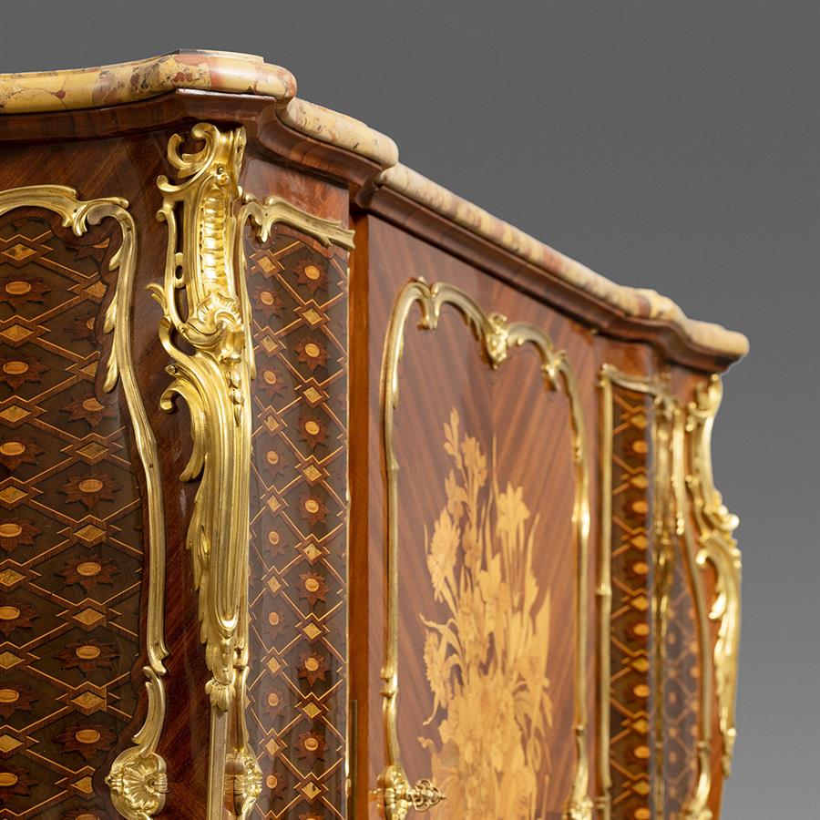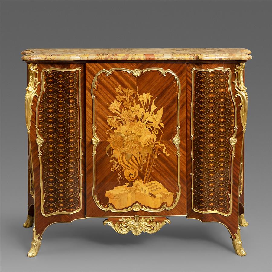路易十五洛可可风格,像木主体,郁金香木四分贴面,阿勒颇彩色角砾岩大理石顶面。中央柜门铜鎏金茛苕枝叶边条开光,内部多种木材镶嵌极为精美繁复的花卉乐谱纹饰,两侧及柜体两侧镶板交错的菱形网格内镶嵌向日葵纹饰;立水装饰卷曲的花卉枝叶铜鎏金饰件,立柱装饰上下呼应的铜鎏金茛苕叶饰。柜体背面龙骨右侧有制造商Henry Dasson/1883钢印。