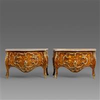 一对路易十五样式铜鎏金装饰缎木和果木细工镶嵌西阿拉黄檀木抽屉柜