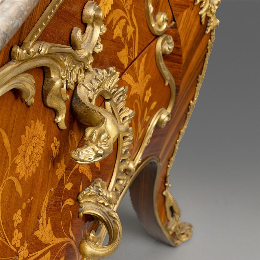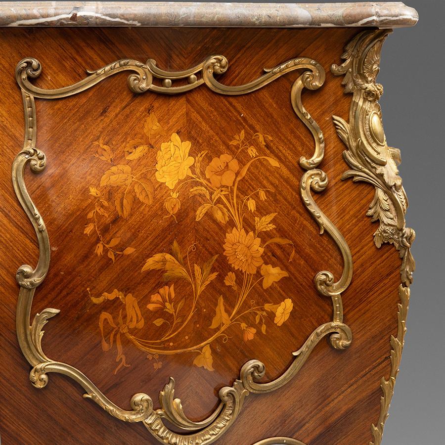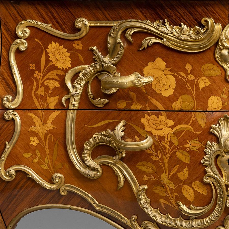 此作品基于1750年代皮埃尔·鲁塞尔和阿德里安·德洛姆合作的抽屉柜(现收藏于巴黎小皇宫)为原型制作。路易十五洛可可风格,山毛榉木主体,西阿拉黄檀木贴面,灰粉角砾岩大理石顶面。双层抽屉面板外廓装饰铜鎏金涡卷边条,缎木底板,梧桐、冬青、鹅耳枥和梨木等多种木材镶嵌花卉枝叶纹,由龙首和棕榈组成的C形拉手,以及扇形茛苕锁眼盖连接而成的内环铜鎏金饰带被誉为洛可可风格在二维和三维设计的最高成就。柜体两侧板铜鎏金边条内缎木、梧桐和冬青等木材细工镶嵌涡卷花束,三弯腿立柱装饰上下呼应的铜鎏金茛苕叶饰。其中一只抽屉柜正面右侧铜鎏金饰件边缘有制造商F. Linke刻印签名。
