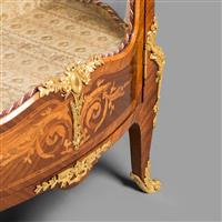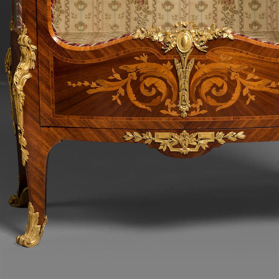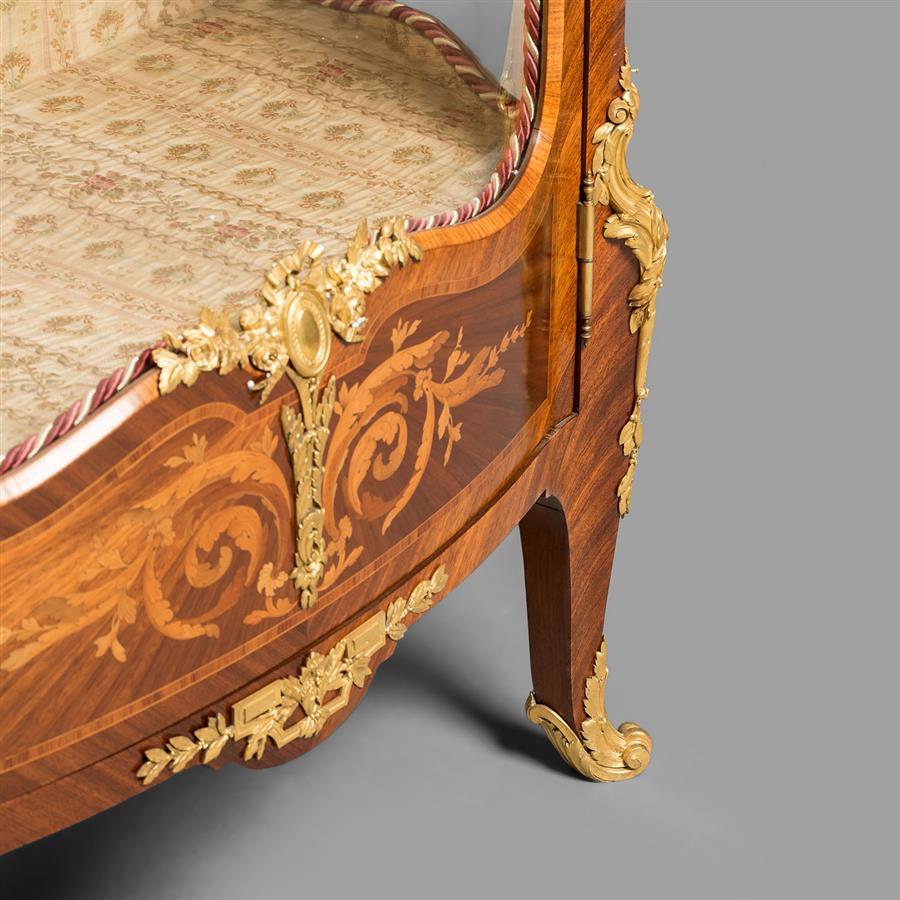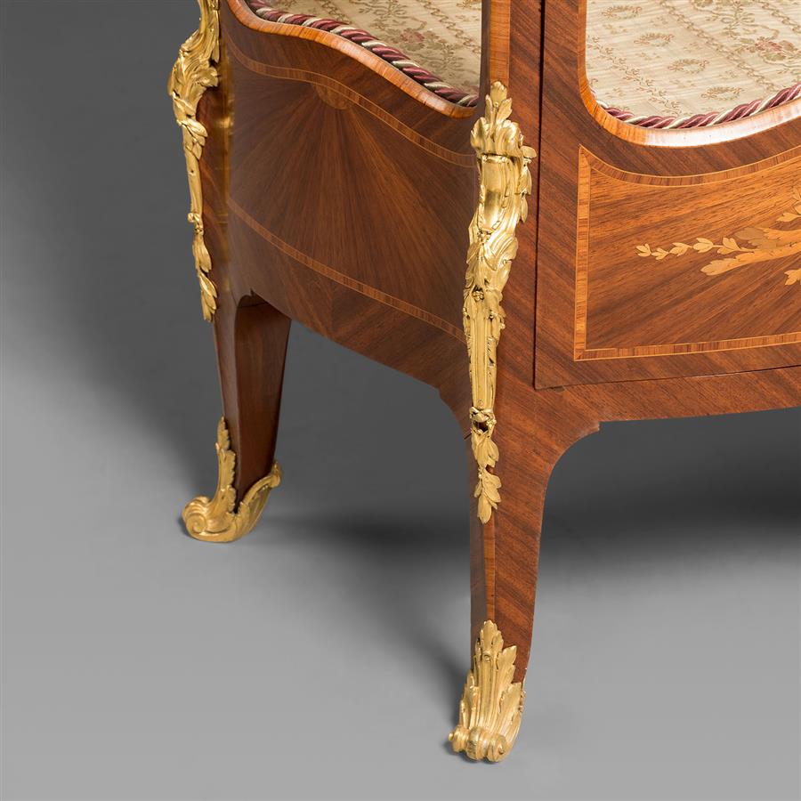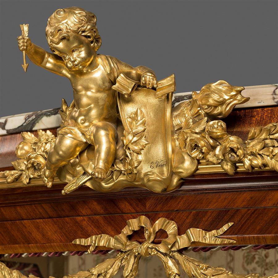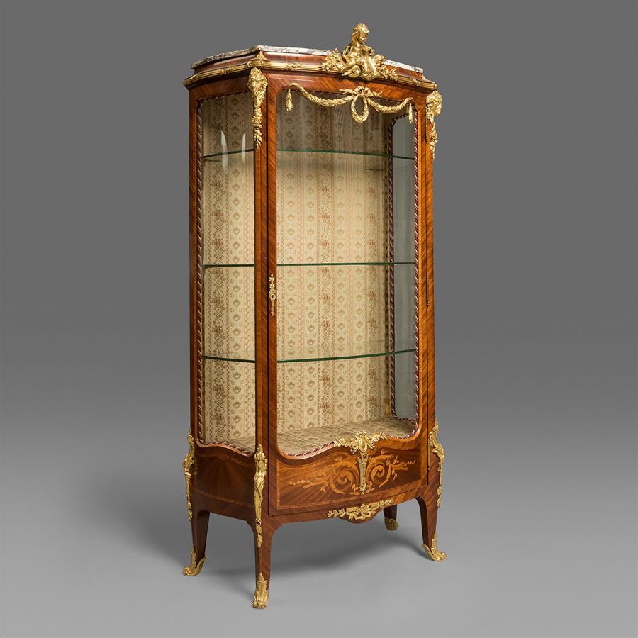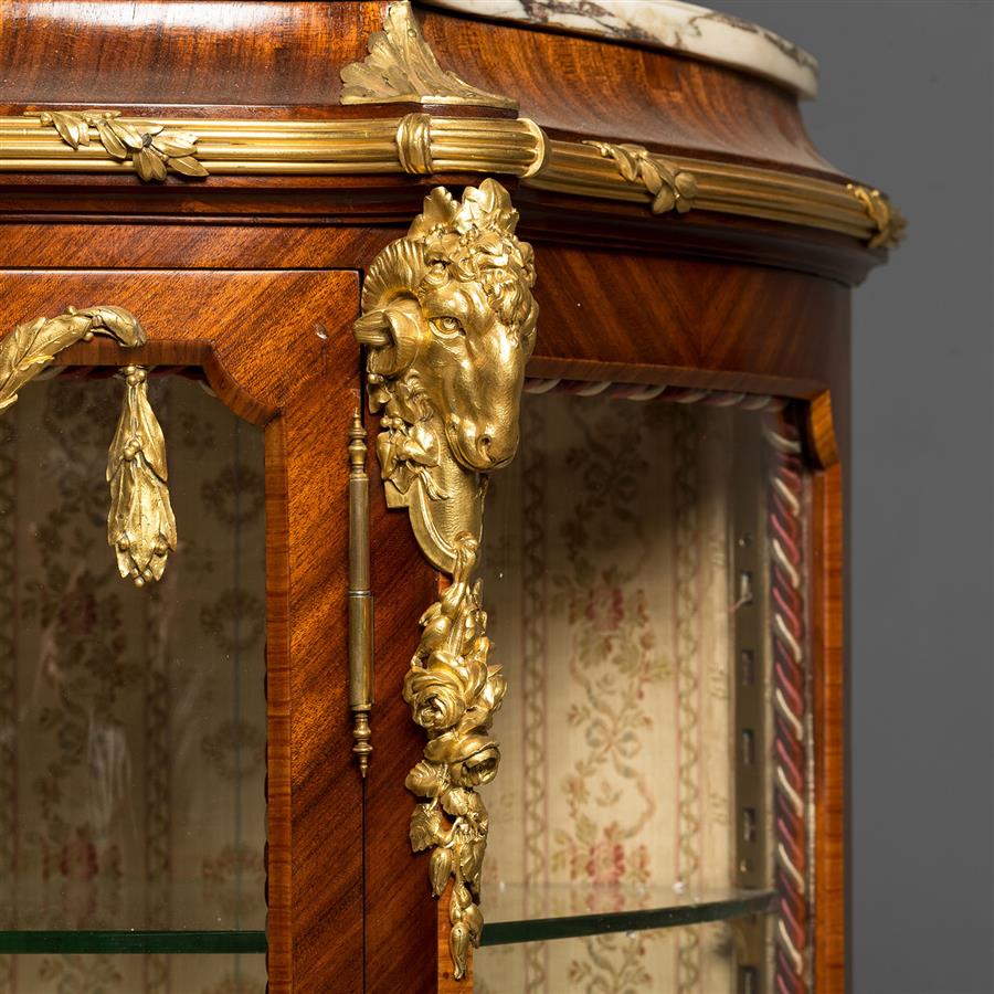 路易十六早期过渡风格,桃花心木主体,西阿拉黄檀木贴面,法国紫罗兰大理石顶面。柜体顶部装饰云端手持爱神之箭和书卷的铜鎏金丘比特,人物四周有花卉果实、火炬和箭筒;三面玻璃橱窗,门顶处有铜鎏金橄榄垂蔓,内部丝质软包背板,四层可调高度的储物格;柜门底部装饰铜鎏金花卉枝叶饰件,缎木和西阿拉黄檀木细工镶嵌左右对称的卷叶纹;立水装饰铜鎏金叶饰,两侧立柱上方装饰铜鎏金羊首,三弯腿装饰上下呼应的茛苕叶饰。顶部铜鎏金丘比特手持的书卷上有制造商E. Verot刻印签名。