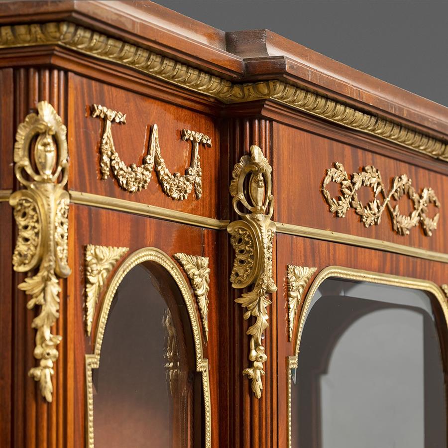 路易十五至路易十六过渡样式,桃花心木主体。柜体上楣中央装饰交叉缠绕的月桂枝叶铜鎏金,两侧装饰玫瑰垂蔓饰带;断层式正立面上层三面玻璃橱窗装饰铜鎏金边条,内部红色丝绒背板,三层高度可调储物格;下层三块面板镶嵌华托(Jean-Antoine Watteau, 1684-1721)风格的洛可可田园爱情马丁漆画绘板。立水、立柱和三弯腿装饰上下呼应的铜鎏金茛苕叶饰。