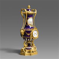 拿破仑三世时期新古典风格。塞弗尔瓷瓶颈部纯金开光彩绘风景人物,两侧装饰铜鎏金叶饰双耳和松果顶盖;瓶身镶嵌白色珐琅表盘,阿拉伯数字和罗马数字双刻度,双发条八天机芯,锚式擒纵机构,整点及半点报时;六角底座上方装饰铜鎏金小天使和莨苕枝叶饰件。珐琅表盘有制造商Monbro Fils Ainé / A Paris 和机芯制造商Jacquier Her签印。