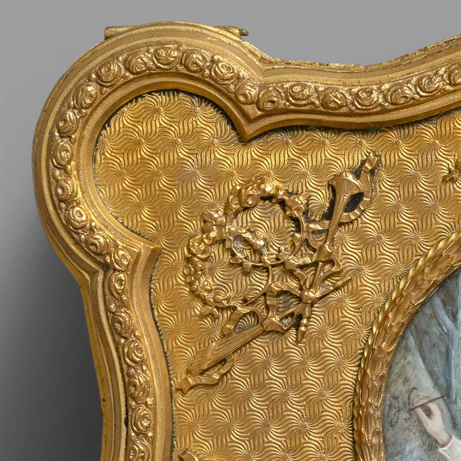 拿破仑三世时期新古典风格鎏金青铜盒体,锦地花卉盒盖四角装饰高浮雕号角花环,中央镶嵌一幅洛可可风格的女艺术家自画像象牙细密画,盒身装饰连续的浅浮雕卵形花蕊纹饰,盒底有经销商Casa Vignes de M P. Sánchez / Florida 361 / B-Aires铜币商标。