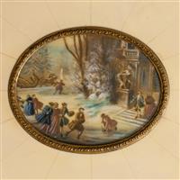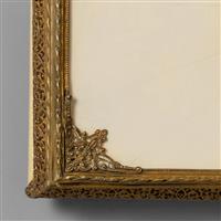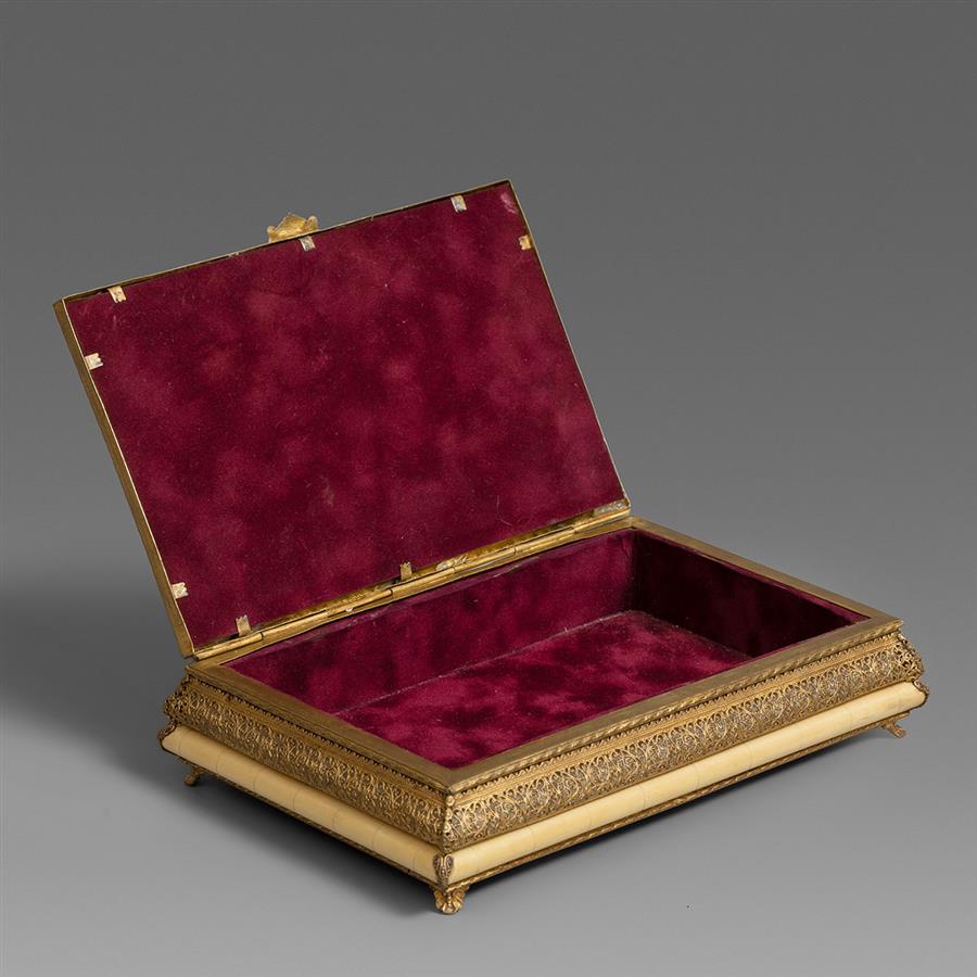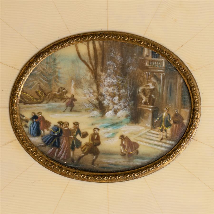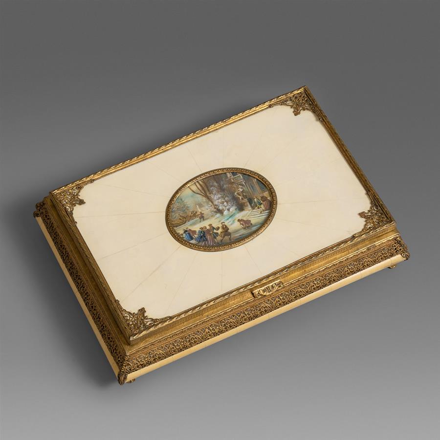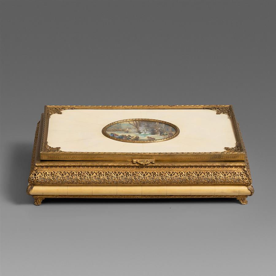 维多利亚时期新古典风格鎏金青铜盒体,骨片贴面盒盖中央镶嵌一幅英式洛可可风格的风景人物象牙细密画,盒身镂刻卷叶花卉,底边镶嵌骨质边条。