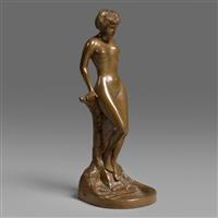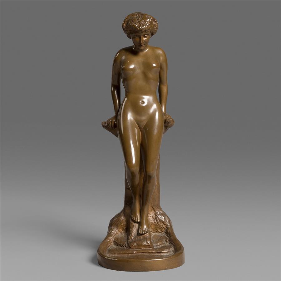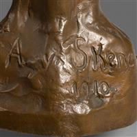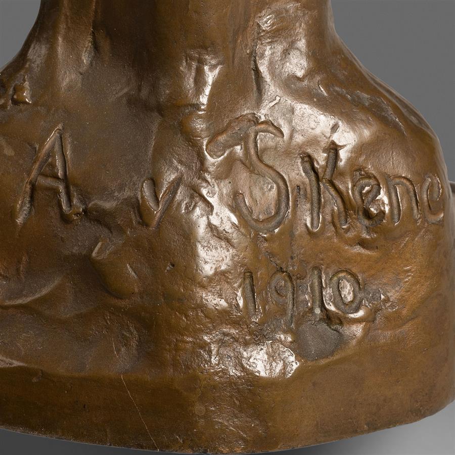 新艺术风格作品描绘了一名裸露曼妙身姿的短发少女形象,少女身体微微向后倾斜,双手支撑在石柱之上,右脚轻踩踮起;人物身姿轻盈,流畅优美,恬静的脸部散发出一丝淡淡的笑容,目光凝视,似乎沉浸在遐想之中。作品底部有艺术家A.V. Skene签名及1910年款。