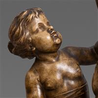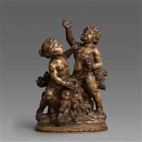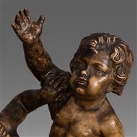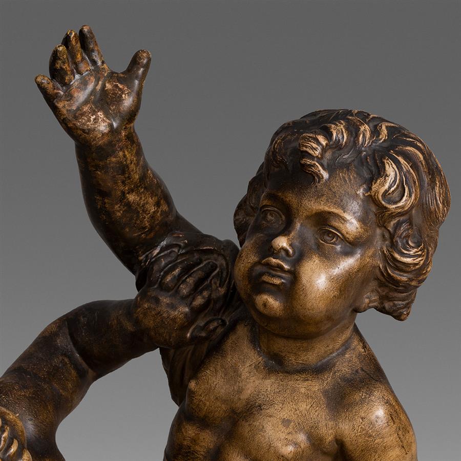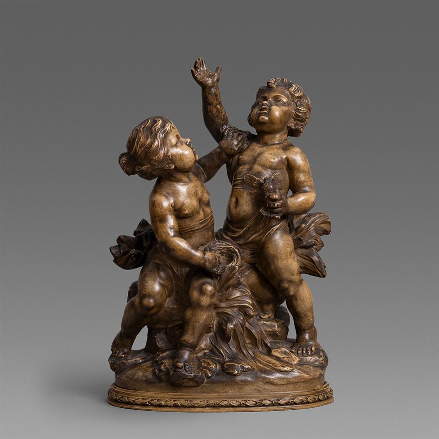 洛可可风格赤陶作品,描绘了两个小天使在山林中放飞鸟儿的场景。两个小天使坐在岩间树丛中,左侧的男孩左脚着地,仰望天空注视着高举右手刚刚放飞的小鸟,左手握着的另一只鸟儿拍打着双翼展翅欲飞;左侧坐在岩上的女孩右手抓着掉落的鸟窝,左手搭在同伴放鸟的上臂上,不舍的看着鸟儿的飞离。作品对人物的神情和动作进行了完美细腻地刻画,突出了儿童天真愉悦的主题氛围。