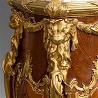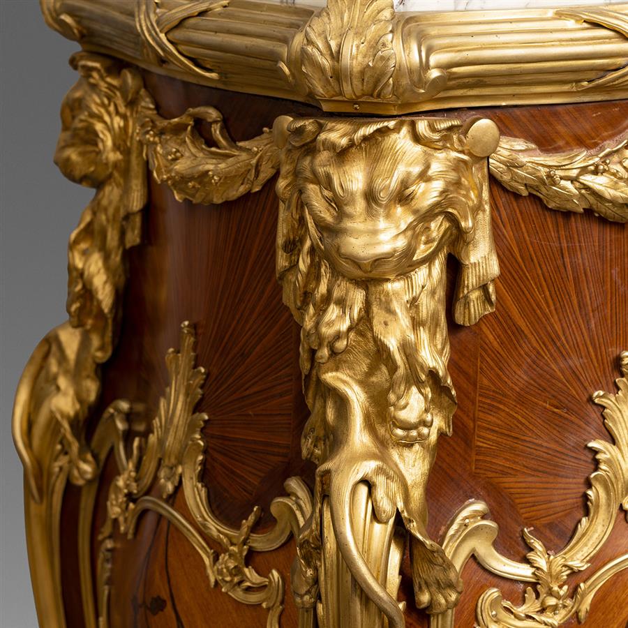 路易十五洛可可风格,像木主体,西阿拉黄檀木贴面。卡拉拉大理石顶面四角装饰铜鎏金茛苕叶饰。台架立面铜鎏金茛苕叶饰开光内西阿拉黄檀木和郁金香木细工镶嵌枝叶花卉纹饰;立柱上方装饰源于奥本和里茨内尔名作国王办公桌上的铜鎏金赫拉克勒斯狮皮,肩部铜鎏金橄榄花环与此相连;立水和弯腿装饰呼应的铜鎏金茛苕叶脉,狮爪底足。