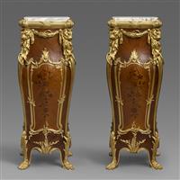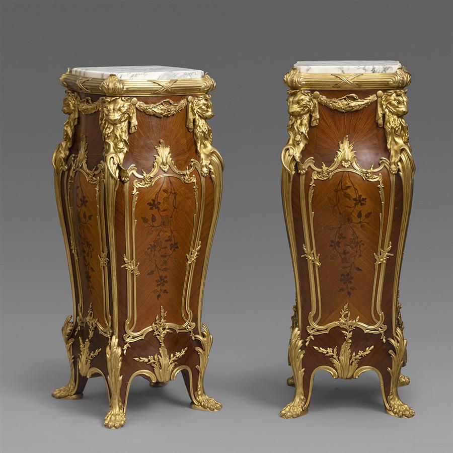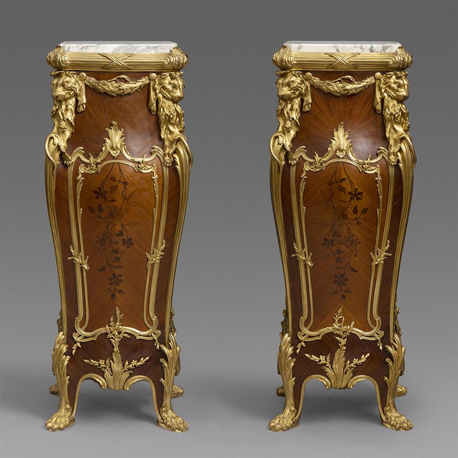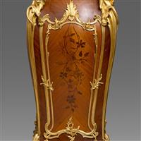 一对路易十五样式铜鎏金装饰西阿拉黄檀木与郁金香木细工镶嵌台架