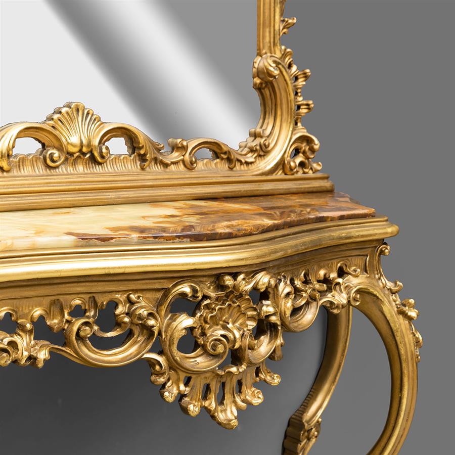 路易十五洛可可风格,山毛榉木框架贴金箔装饰。缟玛瑙桌面,望板雕刻涡卷茛苕,枝形弯腿雕刻卷叶花卉,X形横拉挡中央镂刻扇形涡卷;配套镜框外缘雕刻与桌体呼应的茛苕枝叶。