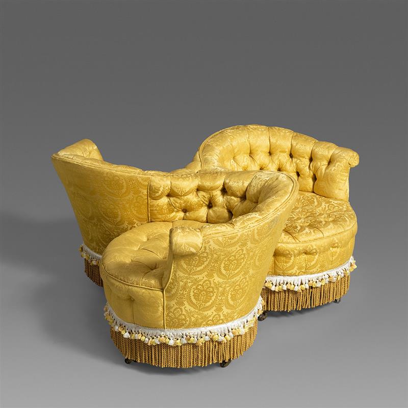 维多利亚时期金色缎面簇绒三人交谈沙发