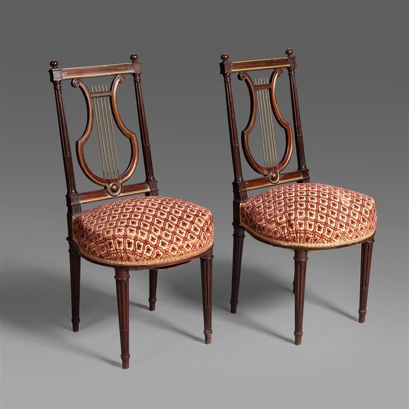 一对路易十六样式黄铜装饰局部金漆桃花芯木雕竖琴靠背椅