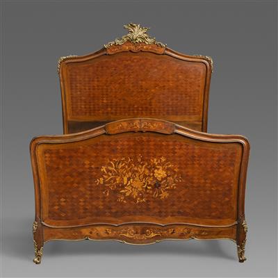 路易十五样式铜鎏金装饰西阿拉黄檀木,缎木和紫芯苏木细工镶嵌玫瑰木双人床