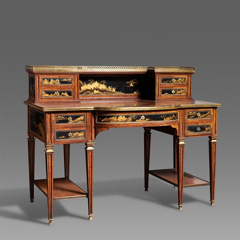 路易十六样式铜鎏金装饰日本漆画西阿拉黄檀木镶花阶梯写字桌