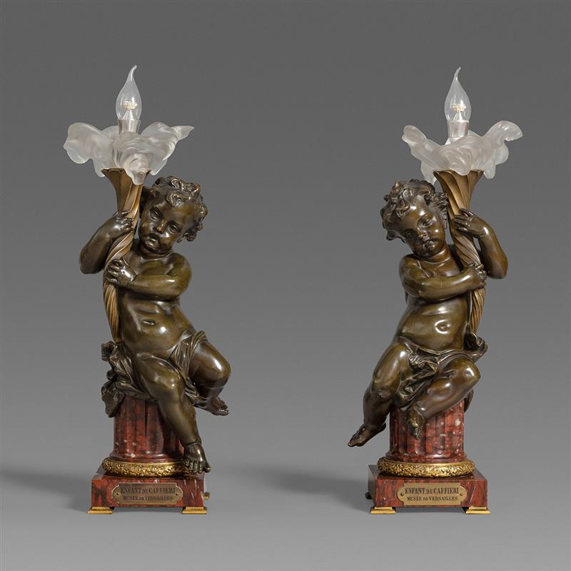 一对路易十六样式青铜人物脂红大理石七枝烛台及铜鎏金台架