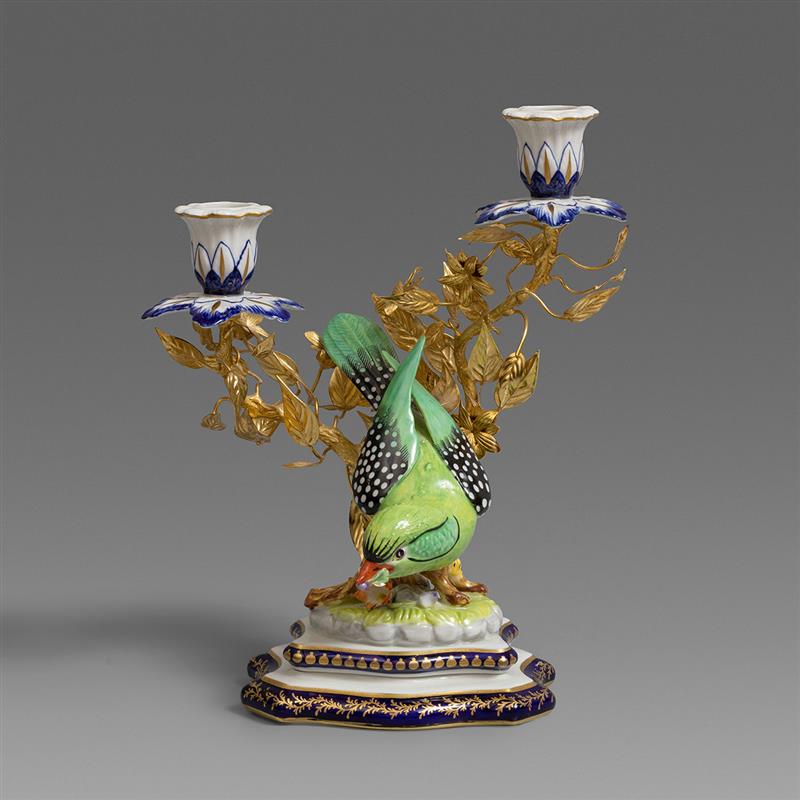 新洛可可风格铜鎏金装饰手绘彩瓷雀鸟双枝烛台