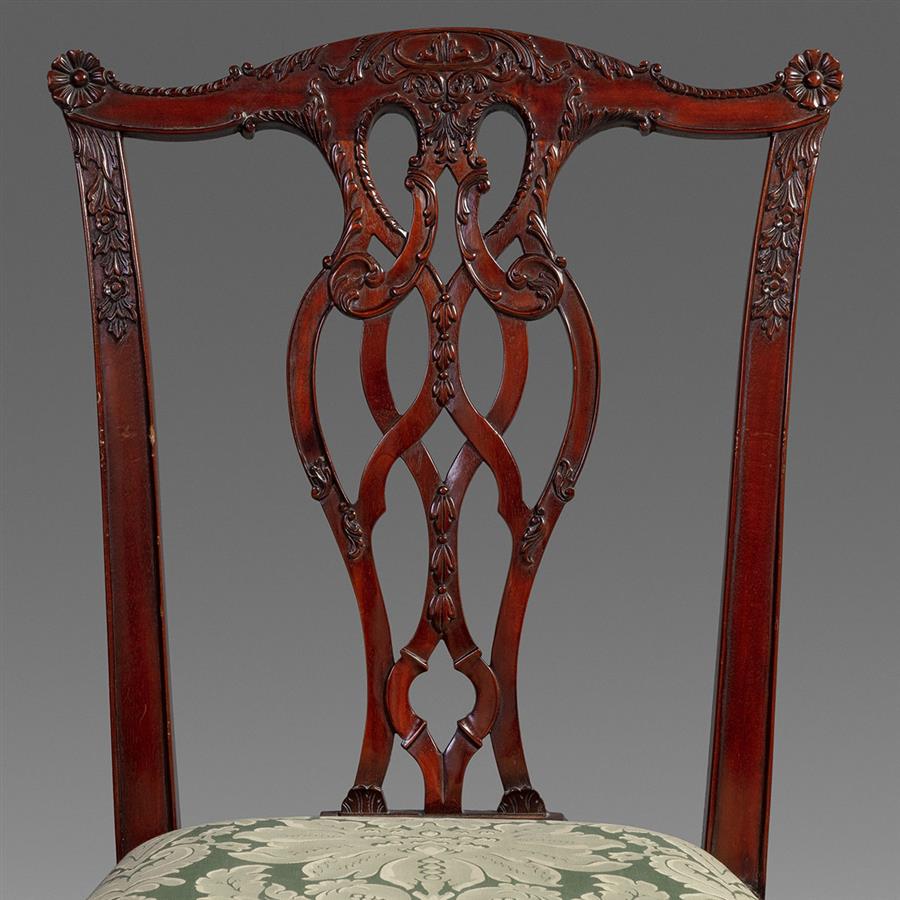 乔治三世齐宾代尔样式,桃花心木雕刻框架。靠背立板透雕绶带和花卉草叶纹饰,前弯腿上方雕刻茛苕叶纹,狮球足。