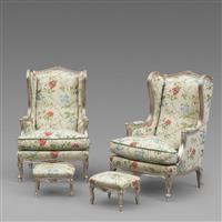 路易十五洛可可风格,贴银箔山毛榉木框架。靠背顶部中央雕刻花卉纹饰,扶手弯曲雕刻卷叶纹,支撑柱内缩于前腿,与座面侧档连接一体;座面望板和弯腿雕刻呼应的花卉纹饰;脚凳雕刻与安乐椅相同的花卉纹饰。米色花卉织锦缎软包靠背和座面。