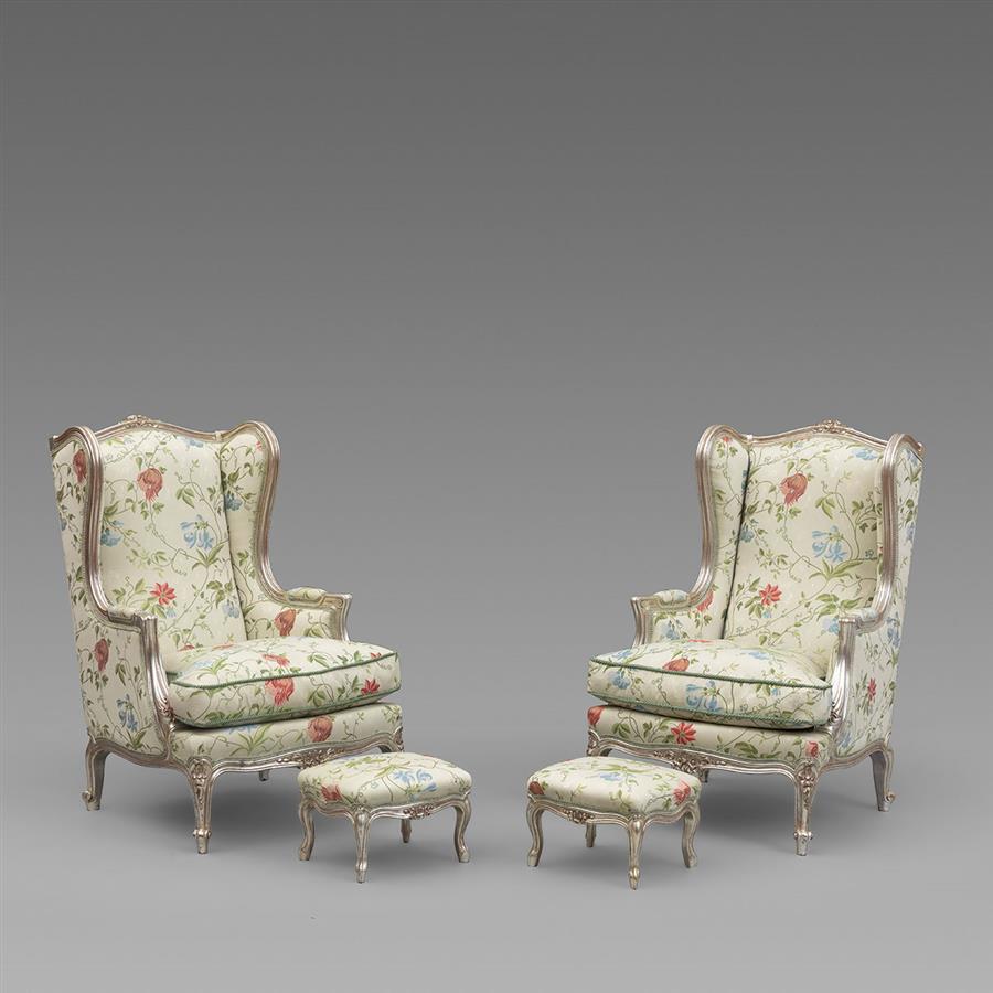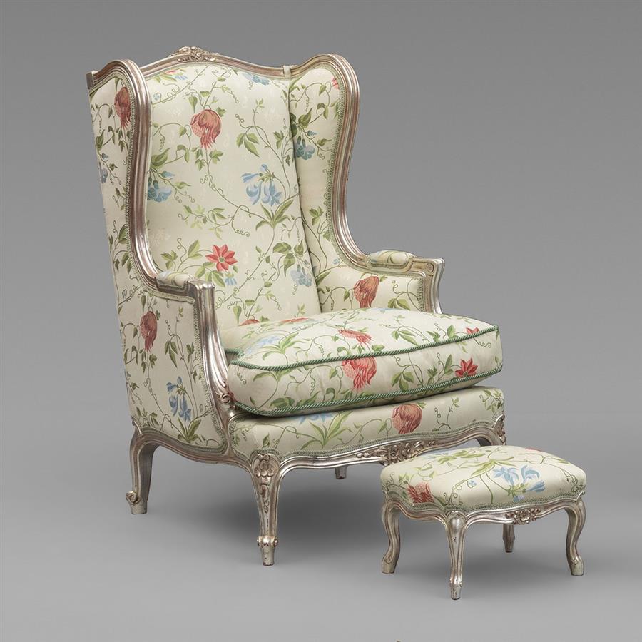 一对路易十五样式锦缎软包贴银山毛榉木雕花安乐椅和脚凳