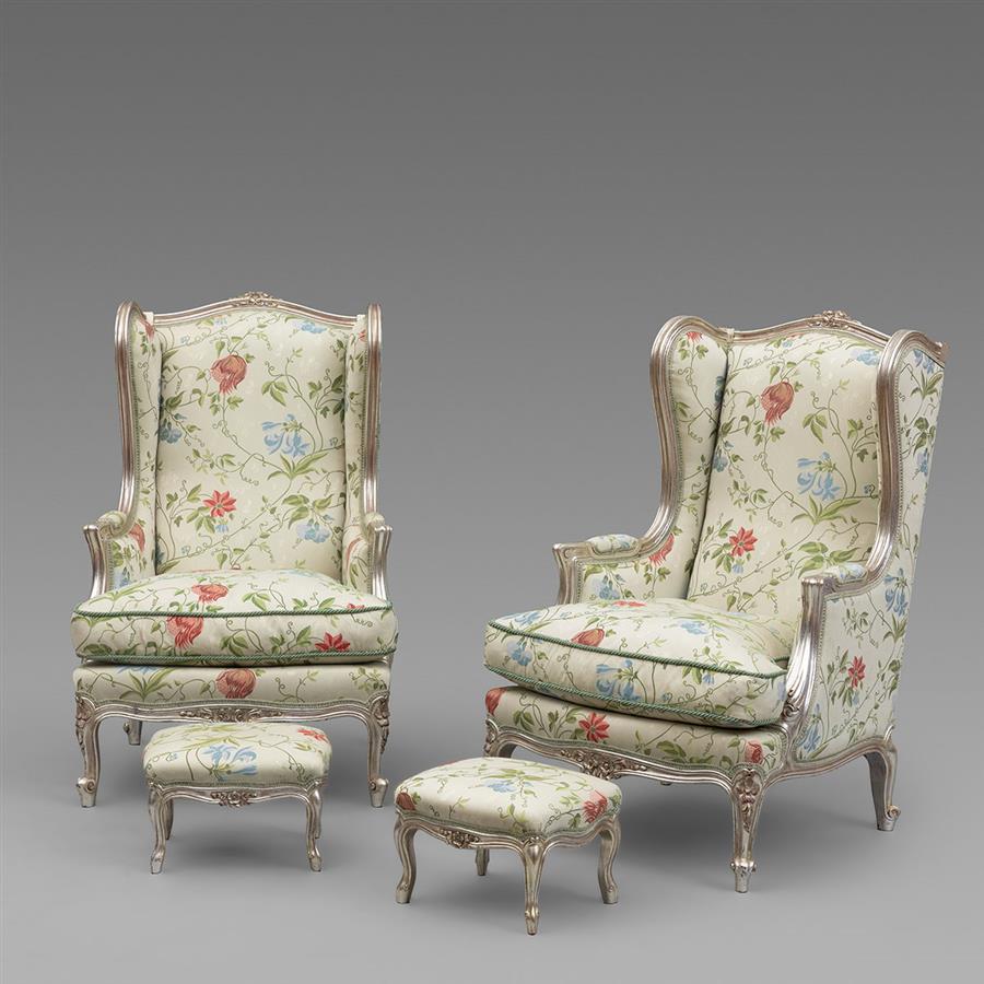A Pair of Louis XV Style Brocade Upholstery Carved and Silver Leafed Beech Bergères à Oreilles with Ottoman