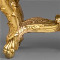摄政样式巴洛克至洛可可过渡风格,贴金箔木雕桌体,贝洛克红纹花岗岩(Griotte de Belloc)顶面。桌面外框浅浮雕连续的茛苕叶饰,望板中央雕刻龙首面具,两侧对称镂刻卷曲的茛苕枝叶;高浮雕卷叶纹弯腿,X型横拉档雕刻由中向外伸展的茛苕枝叶,狮球足。