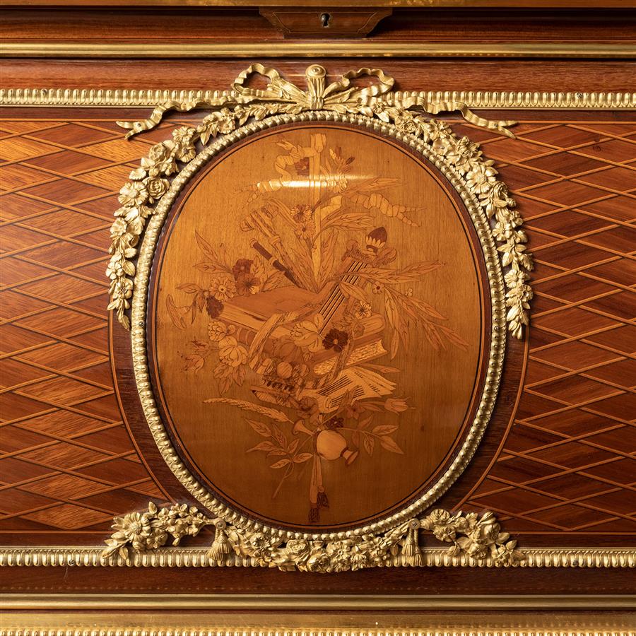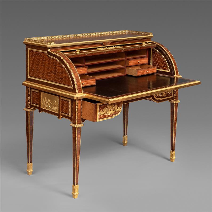 此作品原型来自于现收藏于卢浮宫由路易十六御用家具大师让-亨利·里茨内尔为玛丽·安托瓦内特(Marie Antoinette, 1755-1793)于1784年12月21日交付给杜伊勒里宫(Palais des Tuileries)的著名写字台。桌体顶面装饰铜鎏金矮围栏;滚筒、两侧板和背板缎木和西阿拉黄檀木镶花拼贴格子纹;桌面翻盖中央铜鎏金花环内镶嵌一幅鲜花、乐器和诗集图案的细工镶嵌饰板,内部三层储物格及四只小抽屉,可伸缩烫金牛皮书写面;中楣中央抽屉装饰一幅丘比特嬉戏的铜鎏金浅浮雕饰板,铜鎏金花篮枝叶拉手装饰两侧抽屉,两侧板各装饰代表科学和艺术的铜鎏金小天使浮雕;方锥形桌腿,铜鎏金茛苕叶饰足帽。桌面底部有制造商L. GUEUNIERES JNE / EBENISTE钢印签名。