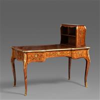 路易十六新古典风格,桃花心木主体,郁金香木四分贴皮。右侧办公桌棕色牛皮烫金书写面,外缘装饰铜鎏金边条,两只楣抽屉装饰铜鎏金盾形茛苕锁眼盖,立柱装饰铜鎏金花团,方锥形桌腿上方装饰铜鎏金橄榄垂幔,铜鎏金螺旋圆锥底足。左侧文件柜与办公桌相同工艺制作,柜顶有铜鎏金人物卡拉拉大理石双发条八天时钟,肩部两侧装饰铜鎏金茛苕叶饰,上楣装饰连续的铜鎏金希腊回纹饰带,柜体上层与桌面水平,双排双列烫金牛皮镶面抽拉文件盒,下层柜膛内部双层储物格。锁板内部有锁具制造商施密特公司ETS SCHMIDT / 3, RUE KELLER / PARIS 钢印。