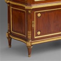 路易十六新古典风格,桃花心木主体。阿勒颇彩色角砾岩大理石顶面下方装饰铜鎏金叶脉边条,三面玻璃橱窗装饰铜鎏金边条,内部四层可调高度储物格;柜膛面板装饰铜鎏金边框,四角装饰铜鎏金团花;立柱顶端装饰铜鎏金垂蔓,底部凹槽内镶嵌铜鎏金麦枝,圆锥底足装饰铜鎏金足帽。