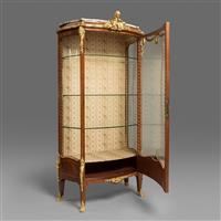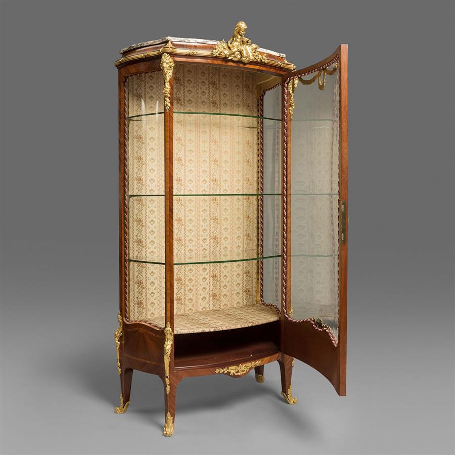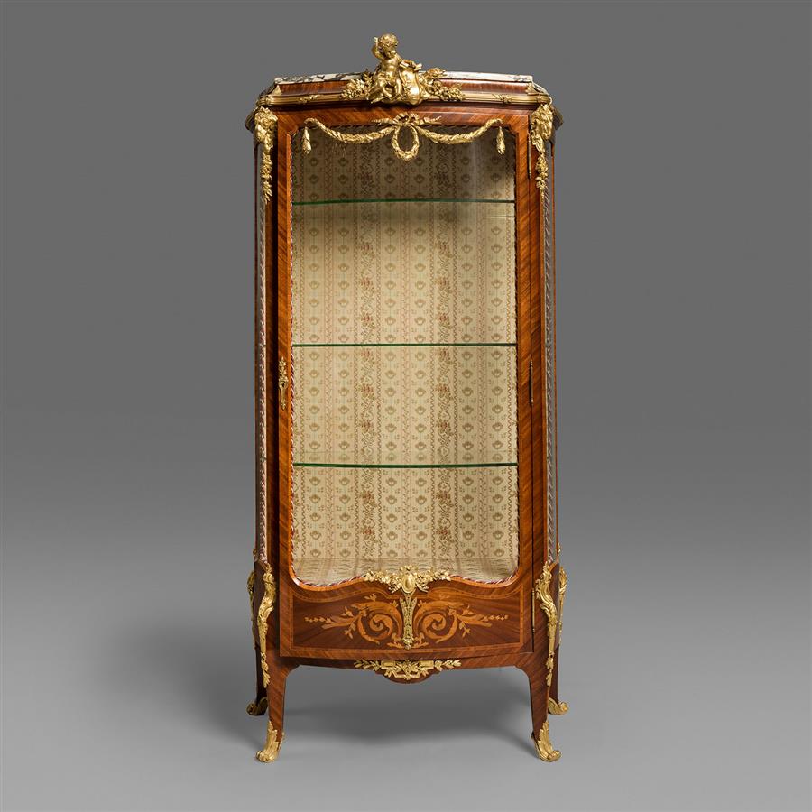 路易十六早期过渡风格,桃花心木主体,西阿拉黄檀木贴面,法国紫罗兰大理石顶面。柜体顶部装饰云端手持爱神之箭和书卷的铜鎏金丘比特,人物四周有花卉果实、火炬和箭筒;三面玻璃橱窗,门顶处有铜鎏金橄榄垂蔓,内部丝质软包背板,四层可调高度的储物格;柜门底部装饰铜鎏金花卉枝叶饰件,缎木和西阿拉黄檀木细工镶嵌左右对称的卷叶纹;立水装饰铜鎏金叶饰,两侧立柱上方装饰铜鎏金羊首,三弯腿装饰上下呼应的茛苕叶饰。顶部铜鎏金丘比特手持的书卷上有制造商E. Verot刻印签名。