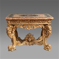 乔治三世洛可可风格,胡桃木桌体。彩色硬石镶嵌桌面使用黑色大理石打底,中央彩色硬石镶嵌一幅精美的静物图案;希腊双耳陶壶、代尔夫特茶杯、葡萄、牵牛花、小鸟…弯腿立柱上方贴金雕刻茛苕叶脉,狮球足。