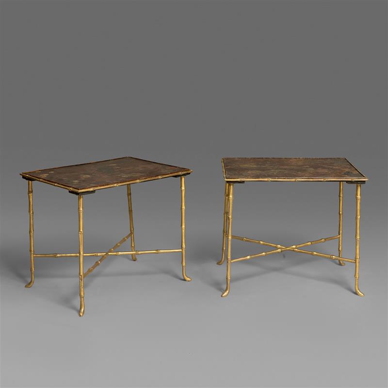 一对好莱坞风尚风格漆画桌面黄铜仿竹边桌