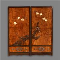 A Late Meiji Period Carved Bone and Boxwood Inlaid Acacia and Walnut Two Folding Screen
