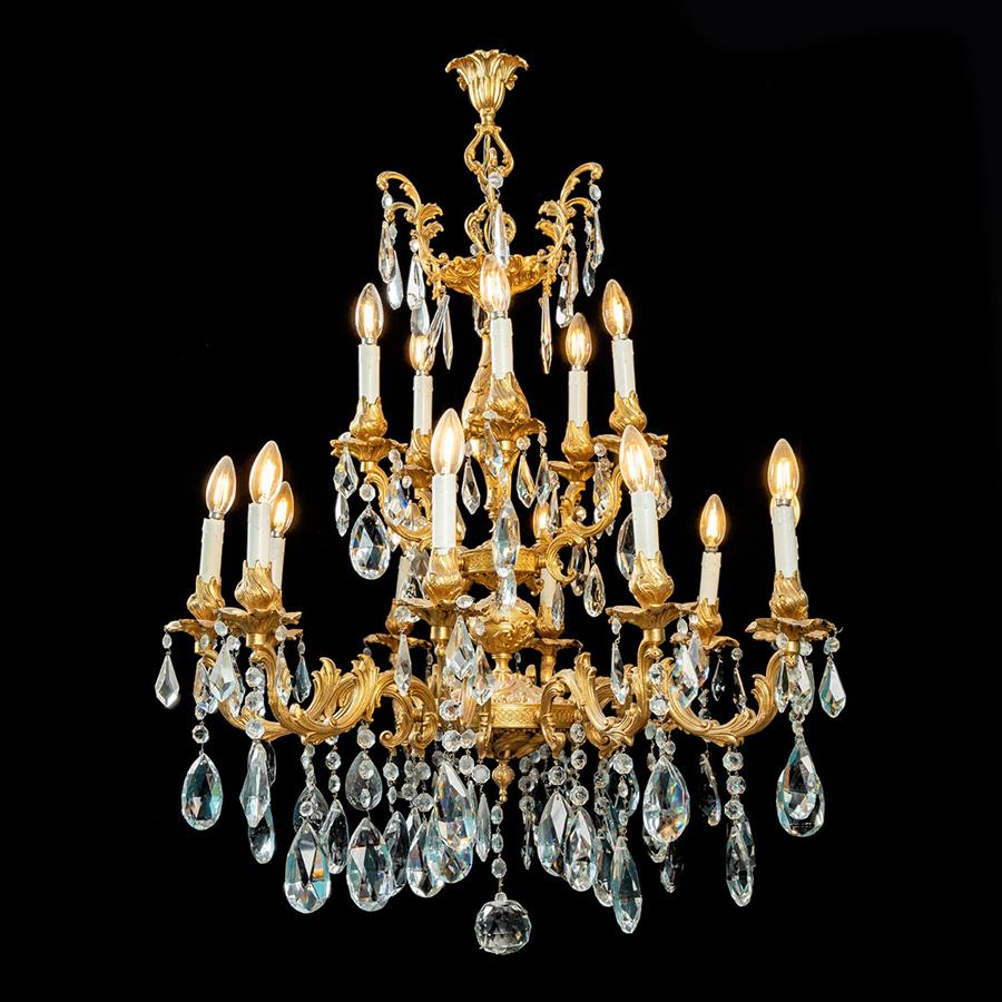 法国路易十五洛可可风格,铜鎏金灯体,吊灯分三层结构,灯冠部分垂吊水滴形和多面体切割水晶;第二层为六枝阿坎瑟斯灯枝,烛枝部分垂吊相同饰片;最下层十枝灯枝装饰链状水滴形水晶饰件;底部垂吊有多面体水晶球。