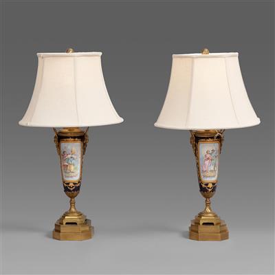 一对路易十六样式铜鎏金装饰塞弗尔式手绘钴蓝瓷瓶台灯