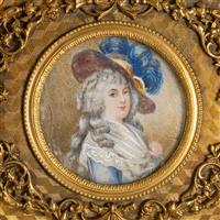 拿破仑三世时期新古典风格鎏金青铜盒体,锦地几何纹盒盖装饰高浮雕花卉宝瓶环饰,中央镶嵌一幅洛可可风格象牙肖像细密画,盒身錾刻浅浮雕卷叶纹。
