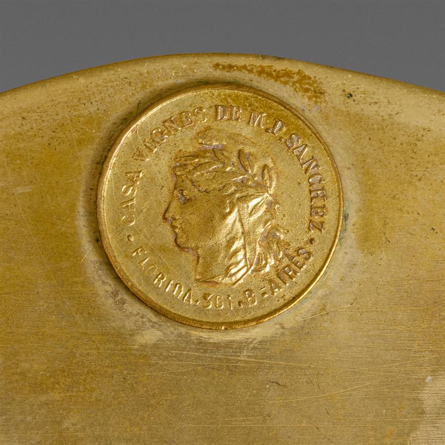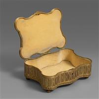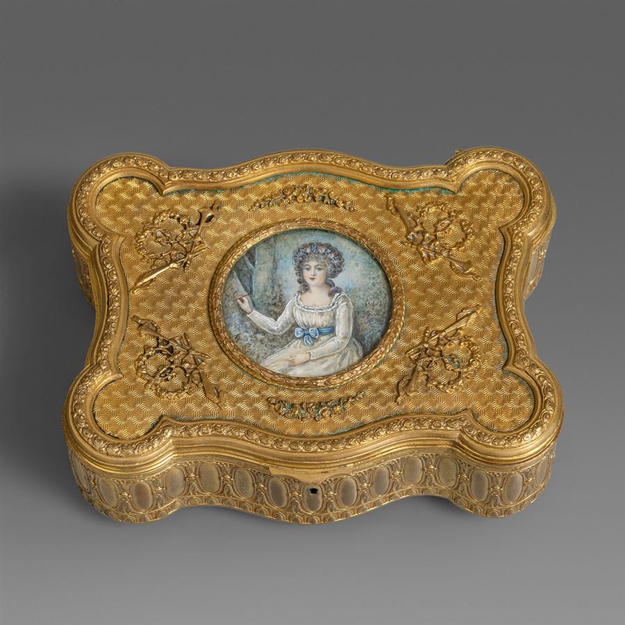 拿破仑三世时期新古典风格鎏金青铜盒体,锦地花卉盒盖四角装饰高浮雕号角花环,中央镶嵌一幅洛可可风格的女艺术家自画像象牙细密画,盒身装饰连续的浅浮雕卵形花蕊纹饰,盒底有经销商Casa Vignes de M P. Sánchez / Florida 361 / B-Aires铜币商标。