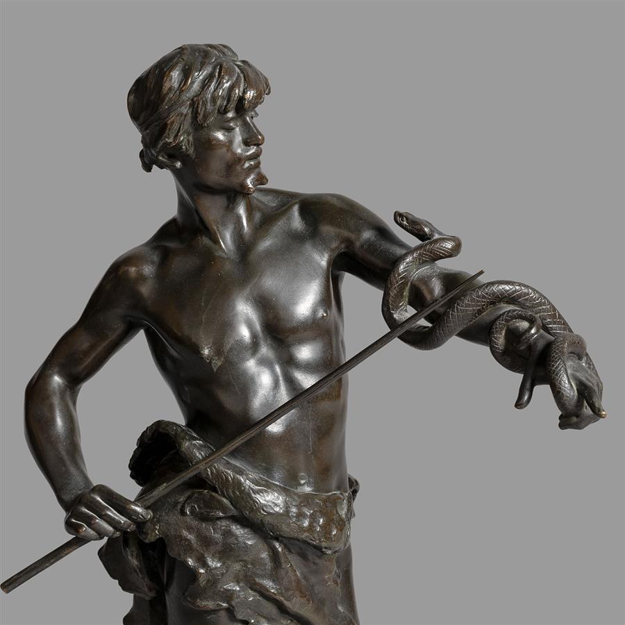 作品描绘一位耍蛇的吉普赛人赤裸上身,下身围着简陋的兽皮。男子身体微向左前方侧倾,抬起的左臂伸向前方,右手持杖调教左臂之上的盘蛇,男子目光坦荡正好与蛇头相对,眼前的毒蛇在他面前好似毫无危险,从而反映出他驯蛇的高超技艺。作品基座上有艺术家E. MARIOTON签名,作品名称FASCINATOR和铸造商Siot Paris印章。