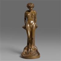 新艺术风格作品描绘了一名裸露曼妙身姿的短发少女形象,少女身体微微向后倾斜,双手支撑在石柱之上,右脚轻踩踮起;人物身姿轻盈,流畅优美,恬静的脸部散发出一丝淡淡的笑容,目光凝视,似乎沉浸在遐想之中。作品底部有艺术家A.V. Skene签名及1910年款。