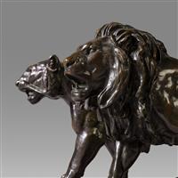 巴里鼎盛期作品,为杜伊勒里宫花园创作。作品生动的描绘了一对行走中的猛虎和狮子力。作品对肌肉及细节纹理刻画的十分细腻,完美的表现描绘对象强劲有力的躯体。作品基部有艺术家Barye签名和铸造商F.BARBEDIENNE. Fondeur和金色FB刻印。