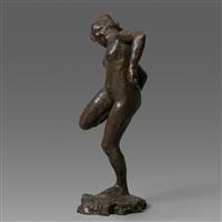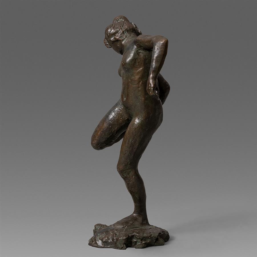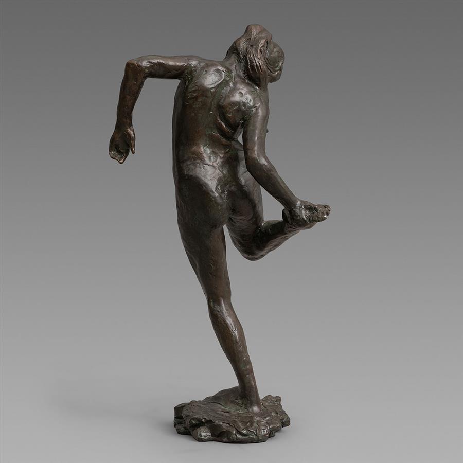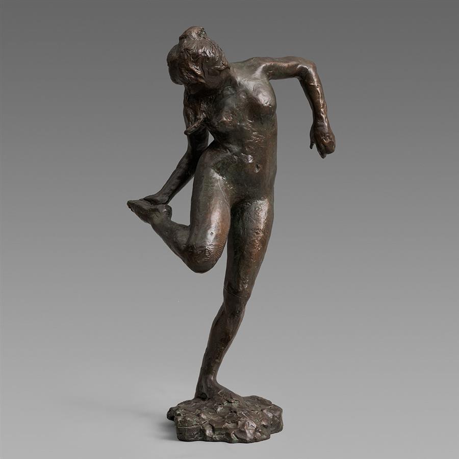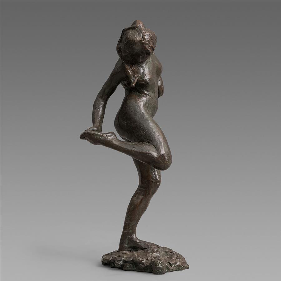 此青铜着色赤陶作品为德加1895至1900年间在巴黎维克托马塞街37号(37 Rue Victor-Massé in Paris)居住时构思,1917年德加去世后在工作室发现的150多件蜡模遗作之一,该雕塑以四种形态铸造青铜作品,此为第四形态。作品表现了一位舞女用右手抓起右脚的场景,女子身体向后扭曲,右脚脚心向上,左臂弯曲试图扬起,右手吃力的翻起脚掌检查。作品通过对人物动作瞬间的抓取,充分体现了艺术家对此题材细致入微的观察和生动的表现。