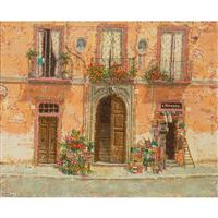 作品描绘了精心布置的室内一隅,门边洛可可风格的靠墙桌上摆放着插满玫瑰的花瓶与鎏金烛台,墙面装饰着一对蓝色哥本哈根挂盘以及一幅人物肖像;柔和的阳光漫入窗纱,温暖得洒在米色墙面,微妙的光影灵动又恬静;透过右侧敞开的门户,户外的葱葱郁郁渐隐渐现映入眼帘。艺术家以简练的笔法,运用低饱和的淡雅色调,透过层层相扣的三重空间,营造出朴实无华的和谐之美。画面右下角有艺术家Poul Rönne签名。