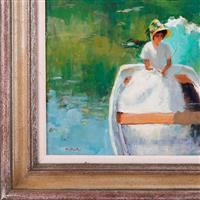 作品以印象派的手法描绘了一位身着白色长裙的少女,乘小船在湖面游玩。作品画面清新,用色淡雅,极具艺术家的个人手法,画面左下角有艺术家H. Barton签名 。