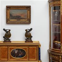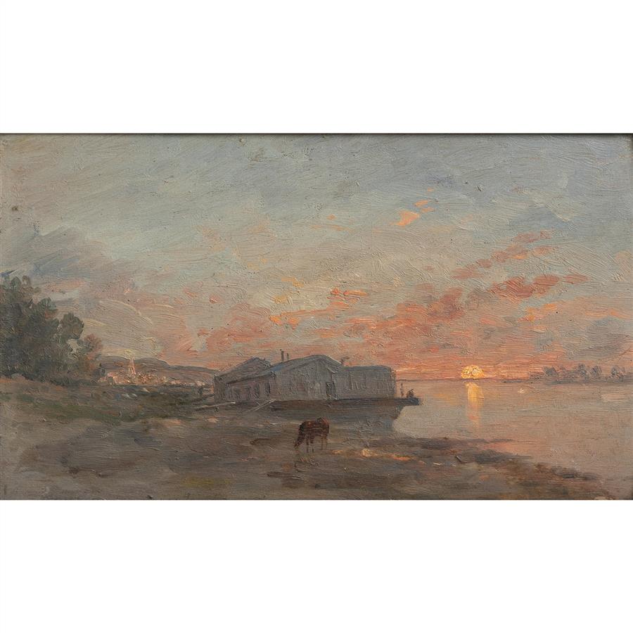 作品描绘塞纳河畔的阿让特伊日落,画面中央一头牛在河边吃草,后面是停靠在岸边的船屋,远方地平线上的落日将天空染成一片橘红。作品整体充满宁静,而对阳光的描绘使得色调明亮灿烂。画面左下角有艺术家Daubigny签名和Argenteuil作品名称,作品配有同时期贴金箔画框,画框底部中央金属铭牌有艺术家信息。