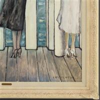 作品清新流畅的色彩描绘了微风细雨中法国特鲁维尔海滨码头,画面中人物修长造型唯美,身着黑色长裙的女士,撑着洋伞矗立在围栏旁,面前海鸥掠过,女子眺望远方的视线与延伸的长廊相呼应,远景处灰色的天空与浅蓝的海面相交,来往的帆船,让人产生着莫名的联想。作品线条简洁笔触奔放,富有语言的用色,表现了宁静的空间感。画面右下角有艺术家Cassigneul签名,此作品附有艺术家本人所出具之真品证明,手写于此作品照片背面。