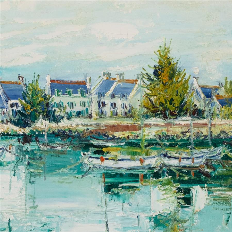 作品描绘了法国布列塔尼杜兰小镇一处码头景色,平静的海面、停泊的船只以及远景的房子置身于优雅浪漫的色调之中,明亮深远的天空倒映在清新的水面上,透出轻薄的蓝色,远处色彩斑斓的房屋采用蓝色点缀,画面用色丰富,整体呈现出一股诱人的蓝色调。画面左下角有艺术家Ardissone签名。