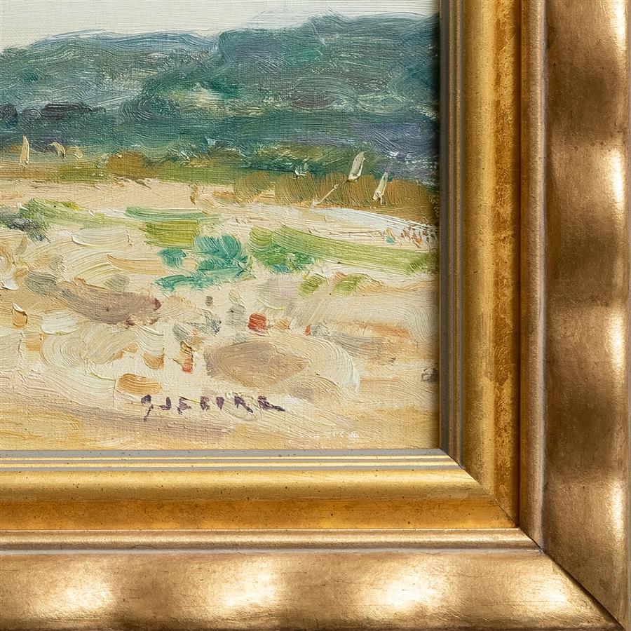 作品以较低的视角描绘了夏日法国南部一处海滩的明媚风景,漫长的沙滩与天空相接,玩耍的游人似乎融入了被微风和阳光浸润的景色中。画面极具空间感,前后过渡色彩对比丰富,笔触强烈富有活力,营造了美好时光的愉悦轻松。画面右下角有艺术家G Sébire签名,画布背面有艺术家再次签名和作品名称。