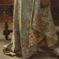 意大利学院派作品描绘了一位站在谱台前的女士,少女十指相交垂于身前,头部微侧,似在出神又似陷入了沉思。前景人物靓丽的服饰、中景覆盖织毯的钢琴与昏暗的背景,由明至暗的色调不但增强了画面的空间感,也突出了画面人物的主体性,艺术家通过一系列对人物和房内景致的细致描绘,生动的诠释了人物沉浸在对美妙乐曲的遐想一刻。画面右下角有艺术家A. Savini签名,背面有画廊和博物馆原始标签,作品配有贴金箔木雕画框。