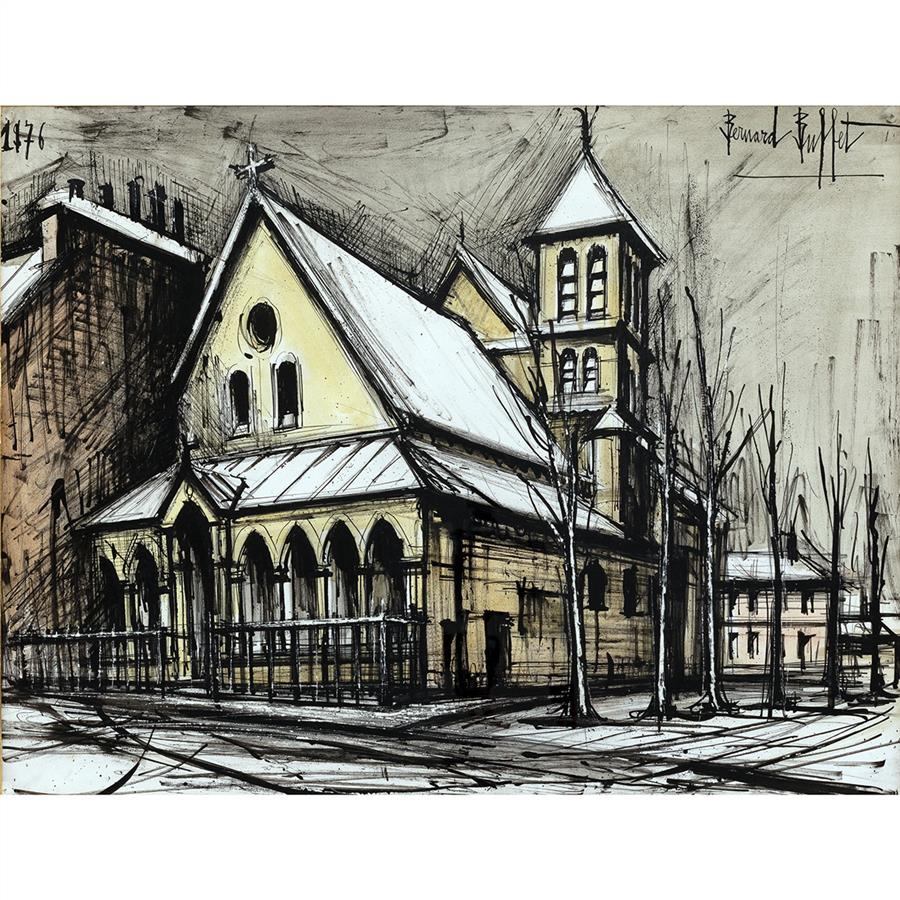 作品描绘了位于巴黎东南圣莫代福塞阿拉姆广场(Place d'Armes)的圣尼古拉教堂(Église Saint Nicolas)一角,黑色墨水勾勒哥特式教堂轮廓,淡色生赭作于建筑立面,钛白描绘屋顶,画面线条凌厉干脆独具布菲特色。画面右上角有艺术家Bernard Buffet签名,左上角有1976年款。此作品经过巴黎贝尔纳·布菲博物馆馆长莫里斯·贾尼耶(Maurice Garnier)验证为真迹。