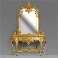 路易十五洛可可风格,山毛榉木框架贴金箔装饰,巴西缟玛瑙桌面,望板雕刻涡卷花卉枝叶,弯腿和拉档雕刻茛苕枝叶;配套镜框顶部镂空雕刻花卉瓶饰,边框雕刻与桌体呼应的茛苕枝叶。