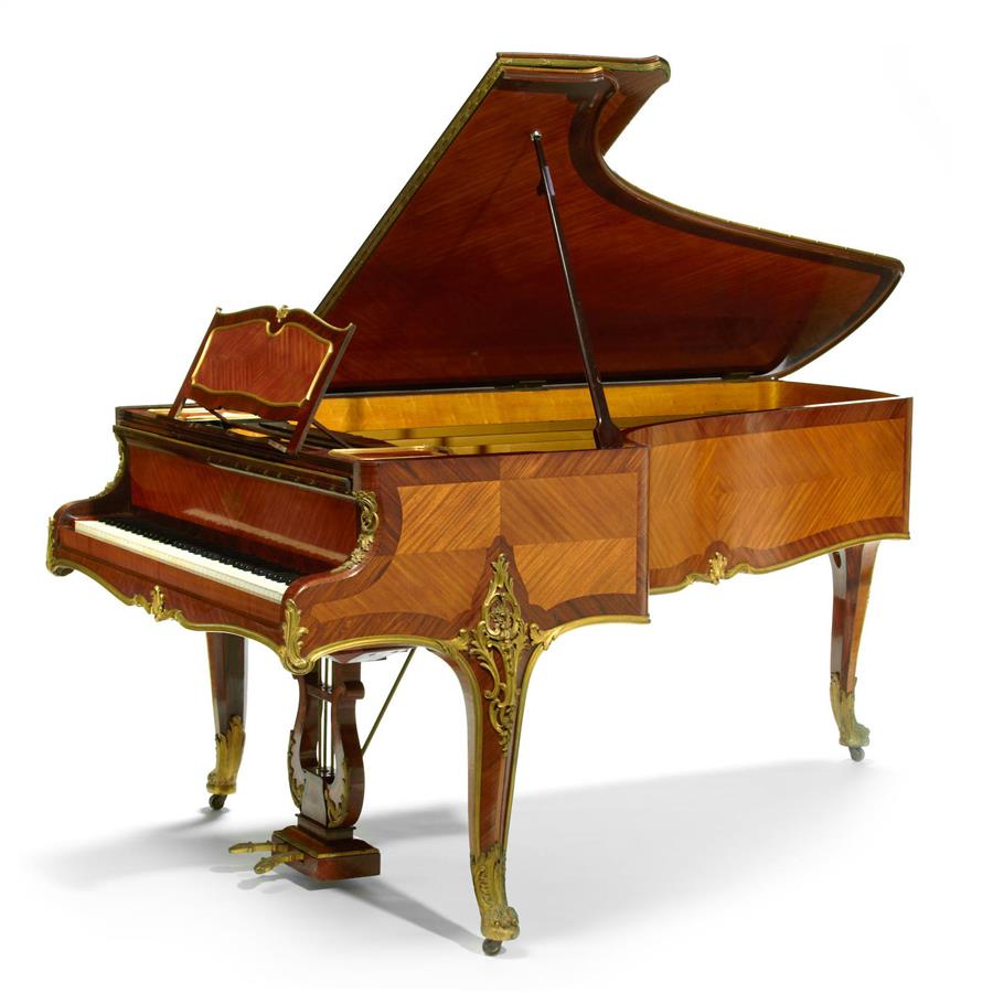 埃拉德八十五键小三角钢琴,林克装饰琴身及铜鎏金饰件。路易十五洛可可风格,胡桃木琴体,象牙琴键,西阿拉黄檀木和缎木镶花帖皮,琴体外缘装饰铜鎏金边条,右腿铜鎏金饰件上有F. Linke签印;钢琴序列号107548,由此可知此琴于1919年生产,键盘盖正面有钢琴制造商Erard / Pairs商标,琴体内部有制琴师及制造商签印。